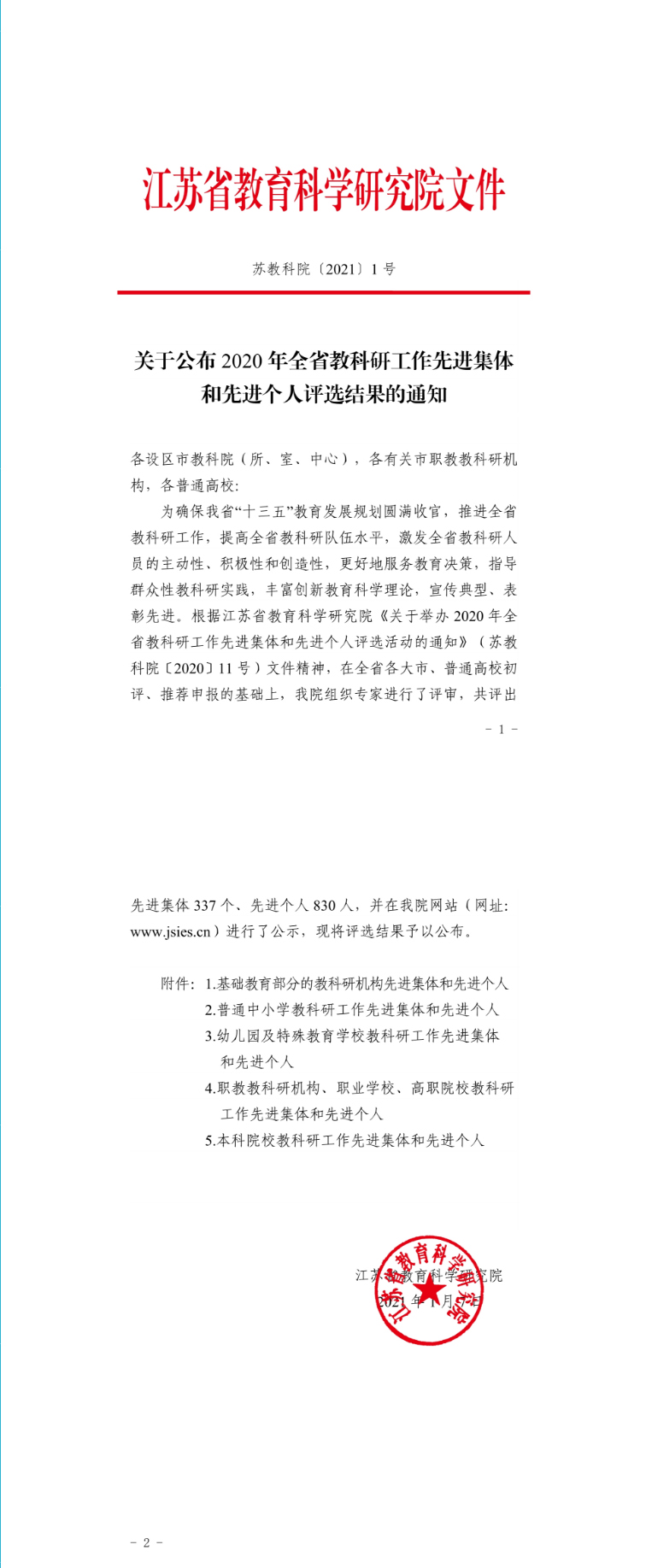近日,江苏省教育科学研究院印发《关于公布2020年全省教科研工作先进集体和先进个人评选结果的通知》,我校高等教育研究院荣获“2020年全省教科研工作先进集体”,洪林同志荣获“2020年全省教科研工作先进个人”。据悉,本次评选,全省各类教育系统中共评出先进集体337个,先进个人830人。其中,本科院校中有18个高校、20个人获此荣誉。