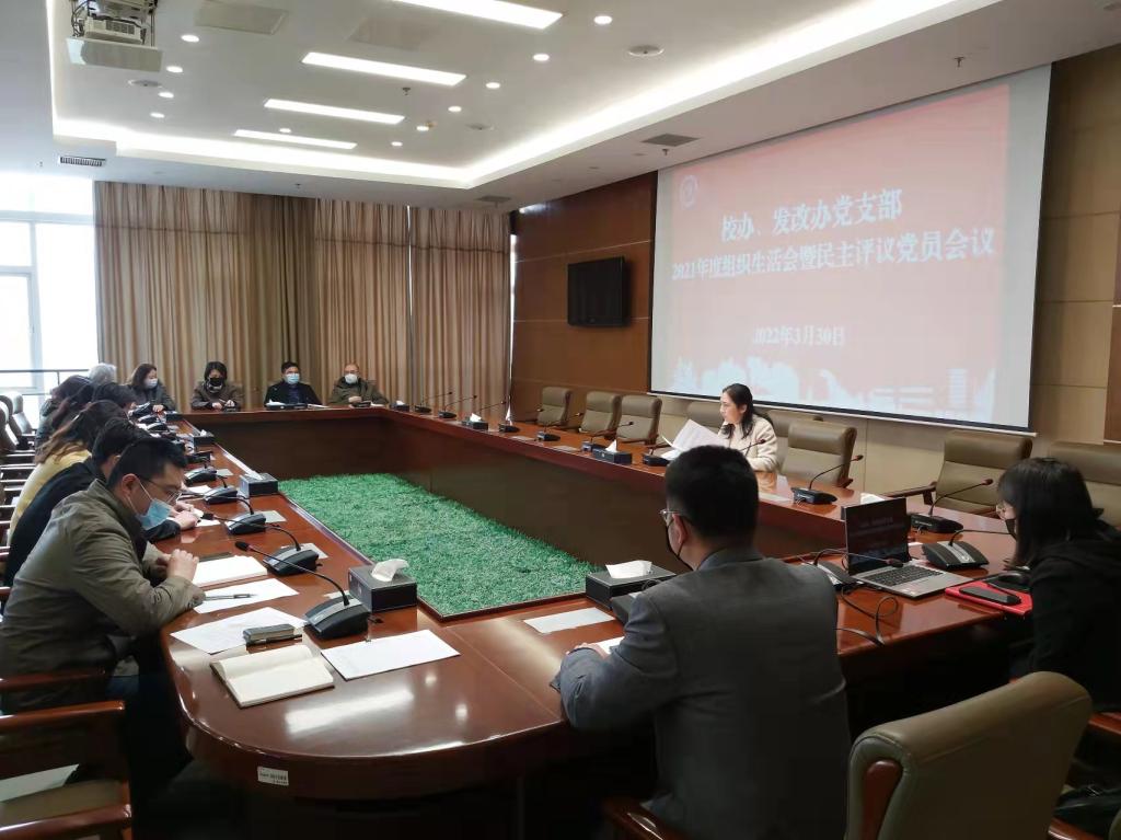 根据校党委关于召开2021年度基层组织生活会和开展民主评议党员工作的部署,2022年3月30日下午,在行政楼9楼会议室,机关党委校办、发改办党支部召开基层组织生活会暨民主评议党员会议。支部书记宋青主持会议,全体党员参加。