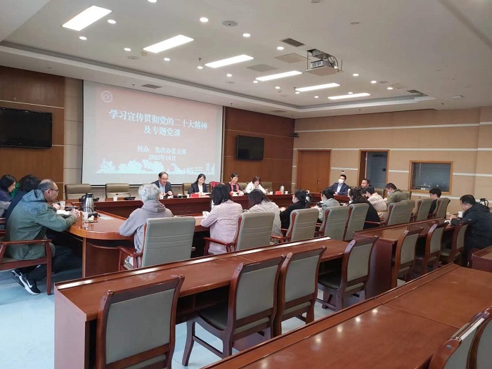 10月25日下午,校办、发改办党支部召开党的二十大精神专题学习会,支部书记、发改办主任、高教院院长宋青主持,校党委第一巡学旁听组组长孙琴、成员王丽坤参会指导,支部全体党员参加。
