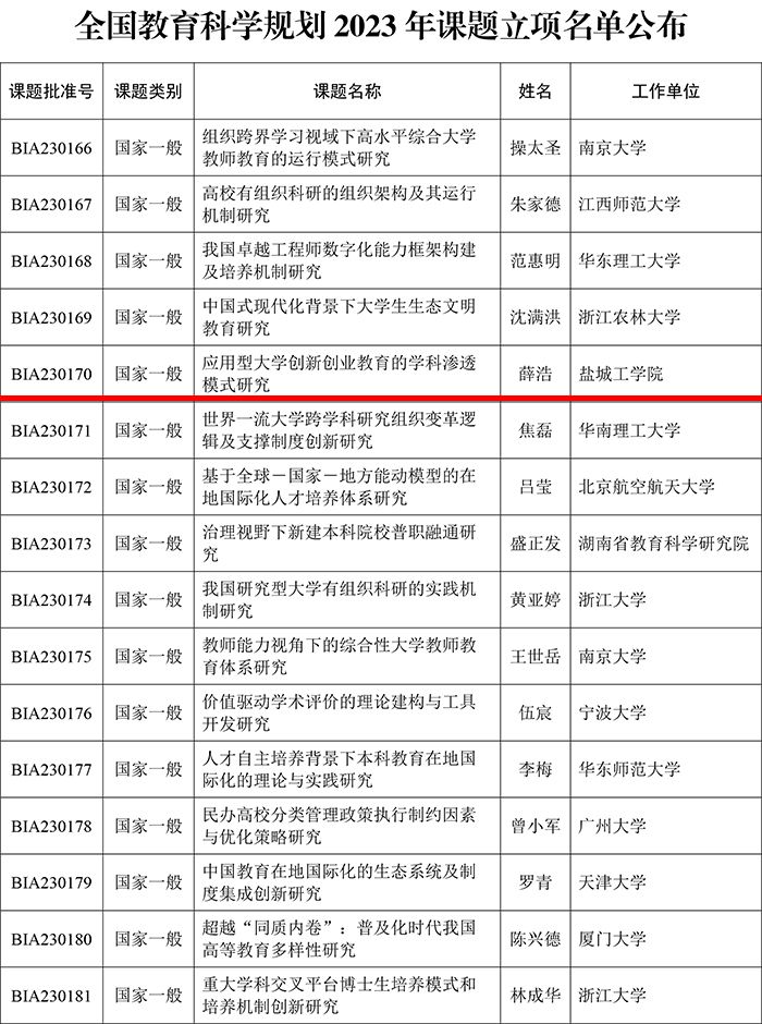 日前,全国教育科学规划领导小组办公室公布全国教育科学“十四五”规划2023年度课题立项名单,我校党委副书记薛浩教授的课题《应用型大学创新创业教育的学科渗透模式研究》,获批国家社科基金教育学项目立项。据悉,此次全国共立项课题524项,其中国家社科基金教育学项目350项,教育部课题174项,立项课题覆盖31个省份和新疆生产建设兵团,涵盖269个单位。