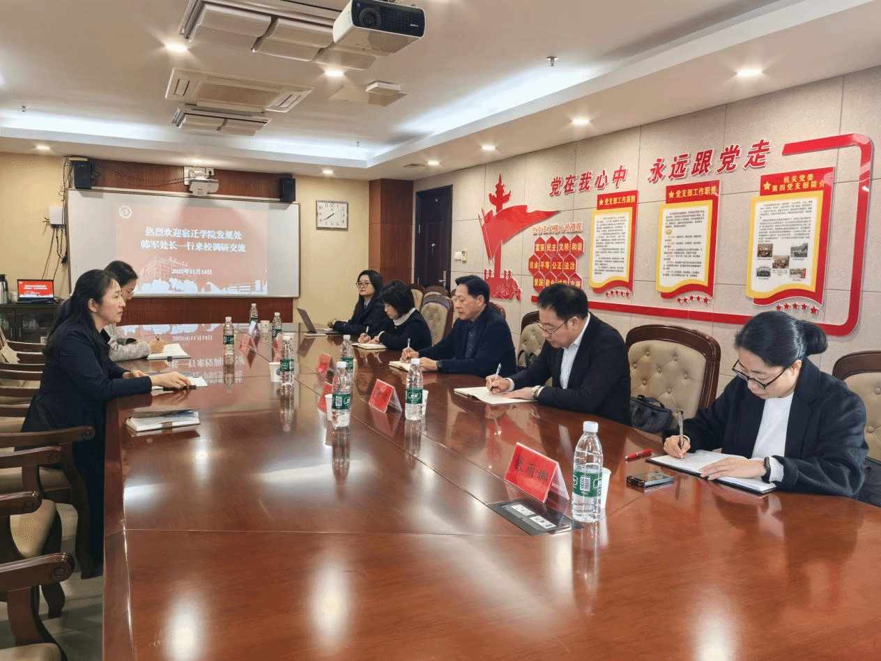 韩军处长对我校的热情接待表示感谢。他介绍了宿迁学院的办学历程、办学特色和服务地方建设的基本情况,并从地方性、综合性、创新性、后发性、开放性等五个方面介绍了学校在“十四五”规划期间取得的成绩。他表示,愿以此次调研交流为契机,进一步加深双方在规划编制工作、省属高校高质量考核等方面的沟通交流。